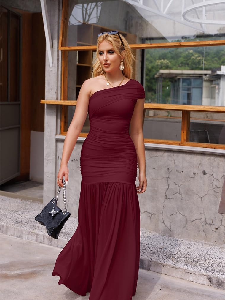 LAGSHIAN Women’s Elegant Formal Long Dress One Shoulder Sleeveless Ruched Bodycon Evening Dress