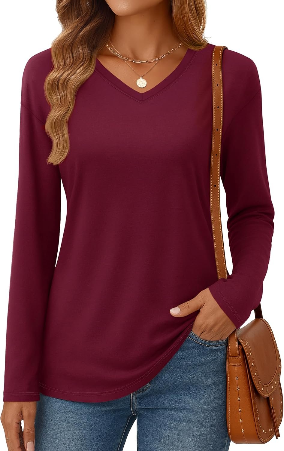 YUCOLEN Long Sleeve Shirts for Women Fall V Neck T Shirts Casual Solid Color Loose Fit Basic Tees Breathable Tops